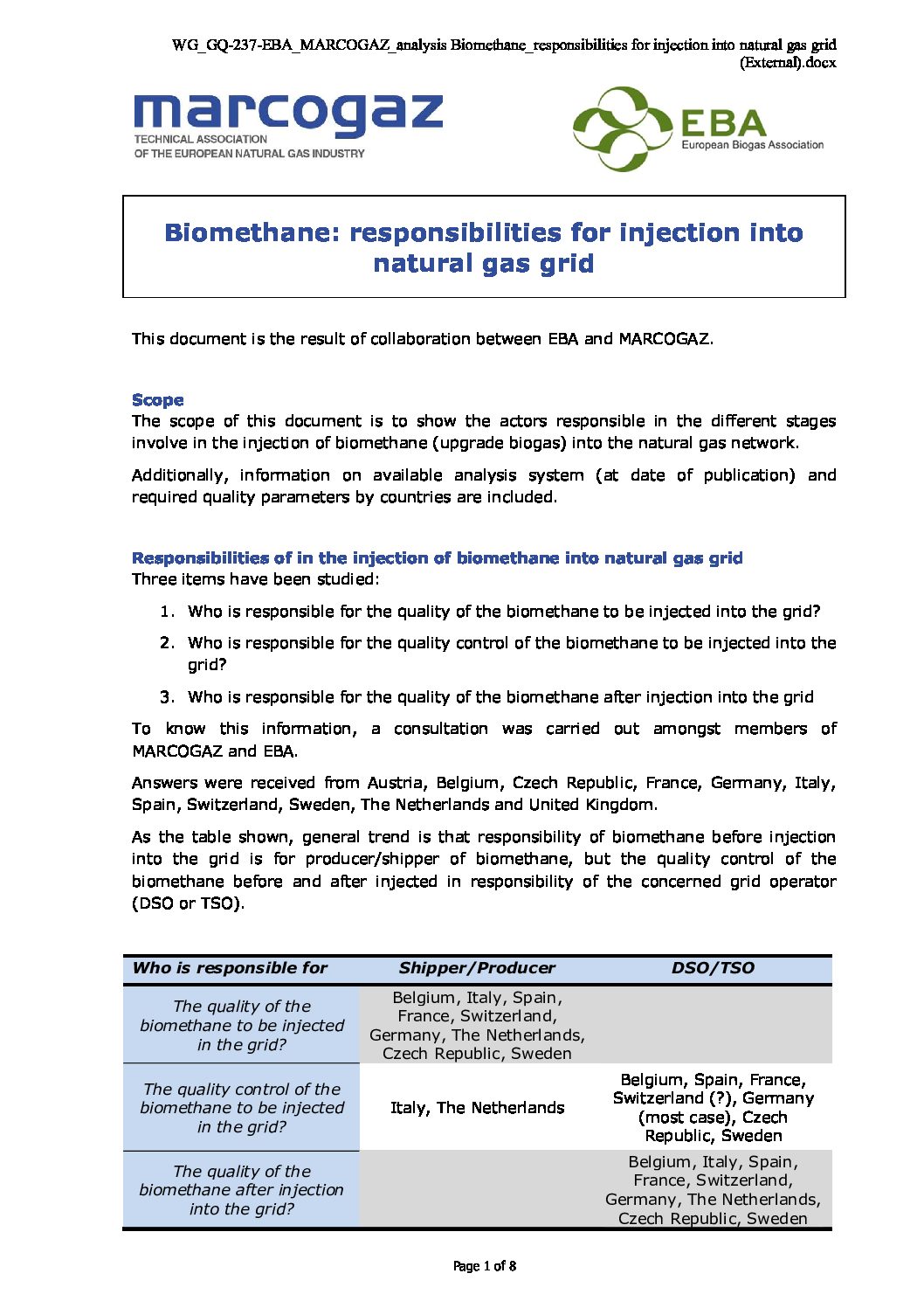 EBA & MARCOGAZ Analysis “Biomethane: responsibilities for injection into natural gas grid”