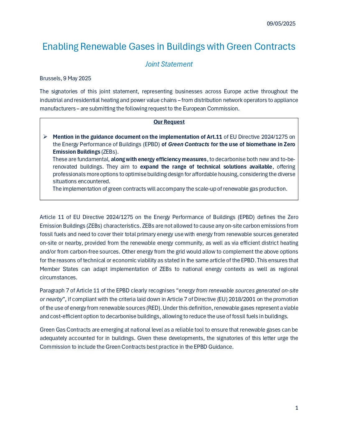 The signatories highlight that while Green Contracts alone won’t achieve ZEB standards, they complement other technologies (e.g., heat pumps, CHPs) and bolster investment in renewable gas, advancing the decarbonisation of Europe’s building stock.