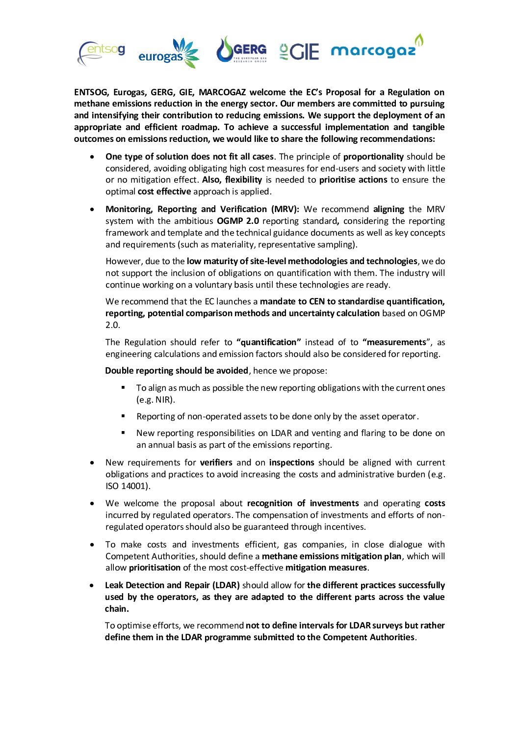 ENTSOG, Eurogas, GERG, GIE, MARCOGAZ welcome the EC’s Proposal for a Regulation on methane emissions reduction in the energy sector. Our members are committed to pursuing and intensifying their contribution to reducing emissions and we do support the deployment of an appropriate and efficient roadmap. (read more…)